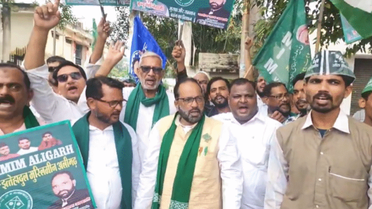 AIMIM के कार्यकर्ताओं ने हिंदूवादी संगठनों पर फतेहपुर मकबरा तोड़ने का आरोप लगाते हुए अलीगढ़ जिला मुख्यालय कलेक्ट्रेट के बाहर जमकर नारेबाजी की.