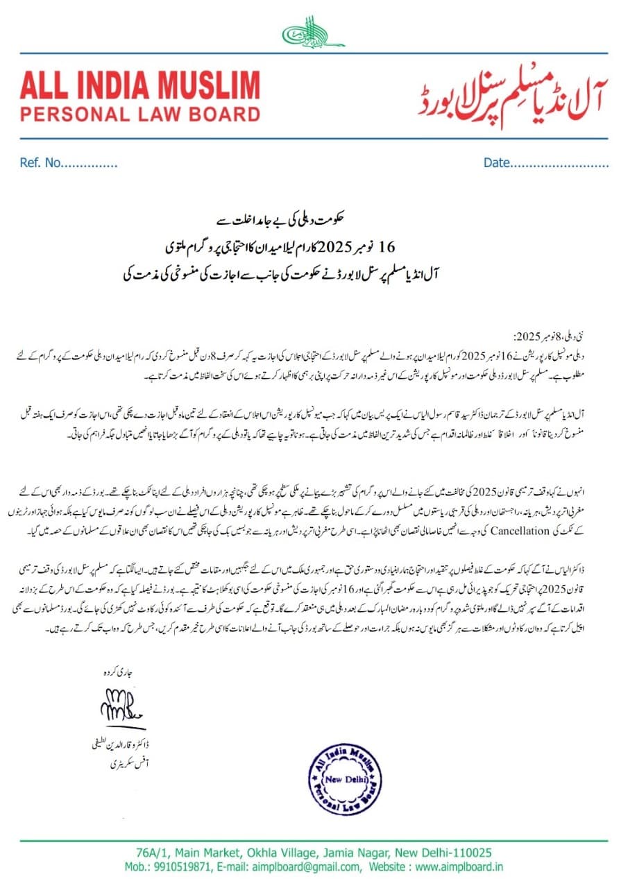 ऑल इंडिया मुस्लिम पर्सनल लॉ बोर्ड ने बयान जारी करते हुए कहा कि दिल्ली म्युनिसिपल कॉरपोरेशन ने आगामी 16 नवंबर 2025 को रामलीला मैदान पर वक़्फ़ संसोधन कानून के खिलाफ होने वाले प्रोग्राम को ये कहते हुए रद्द कर दिया कि रामलीला मैदान दिल्ली सरकार के प्रोग्राम के लिए है. AIMPLB ने दिल्ली म्युनिसिपल कॉरपोरेशन के इस फैसले की कड़े लफ्जों में निंदा की.
