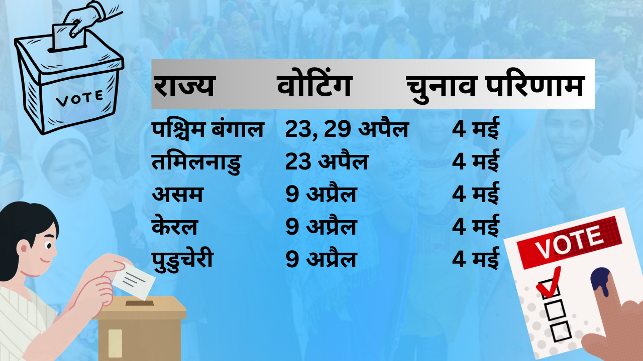 पांचों राज्यों असम, पश्चिम बंगाल, तमिलनाडु, केरल और पुडुचेरी में चुनाव परिणाम एक ही दिन आएंगे. सभी राज्यों में 4 मई को चुनाव के नतीजे सामने आएंगे.