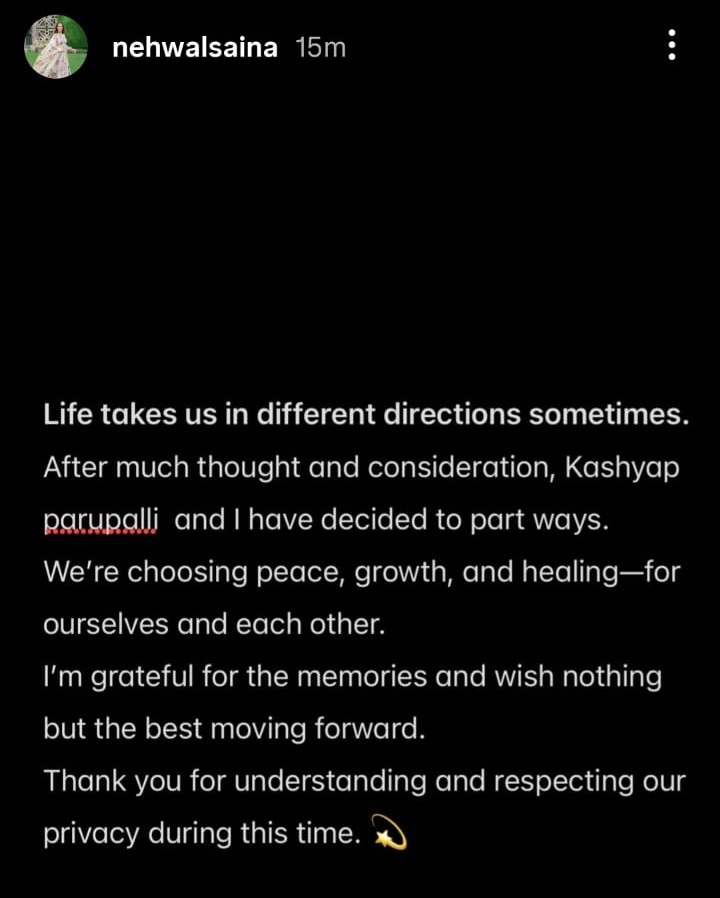 साइना नेहवाल ने इंस्टाग्राम स्टोरी पर इसकी जानकारी देते हुए लिखा कि जिंदगी हमें कभी-कभी अलग-अलग दिशाओं में ले जाती है. बहुत सोच-विचार के बाद, कश्यप परुपल्ली और मैंने अलग होने का फैसला किया है. हम एक-दूसरे के लिए शांति, तरक्की और उबरना चुन रहे हैं.