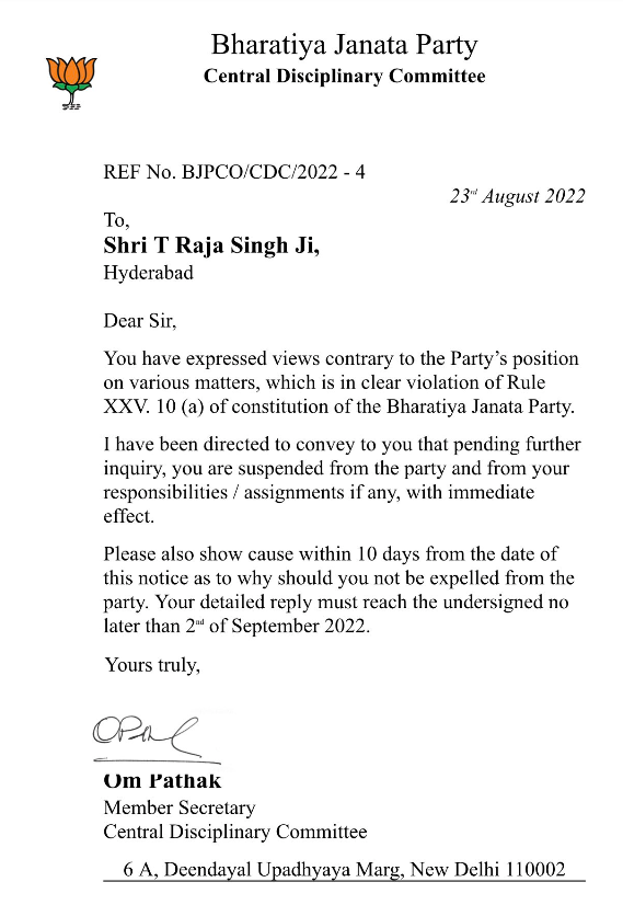 BJP suspends its Telangana MLA T Raja Singh for his controversial remarks targeting Islam