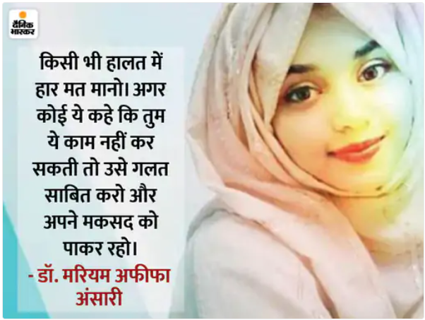डॉक्टर मरियम अफीफा अंसारी बचपन से डॉक्टर बनने का सपना देखा करती थीं. अपने इस सपने को पूरा करने के लिए उन्होंने कड़ी मेहनत की. अब वे भारत की पहली मुस्लिम फीमेल न्यूरोसर्जन बनी हैं. उन्होंने साबित कर दिया कि मेहनत के दम पर हम जिंदगी में हर सपने को पूरा कर सकते हैं. डॉ. मरियम अफीफा अंसारी अभी सिर्फ 27 वर्ष की हैं.