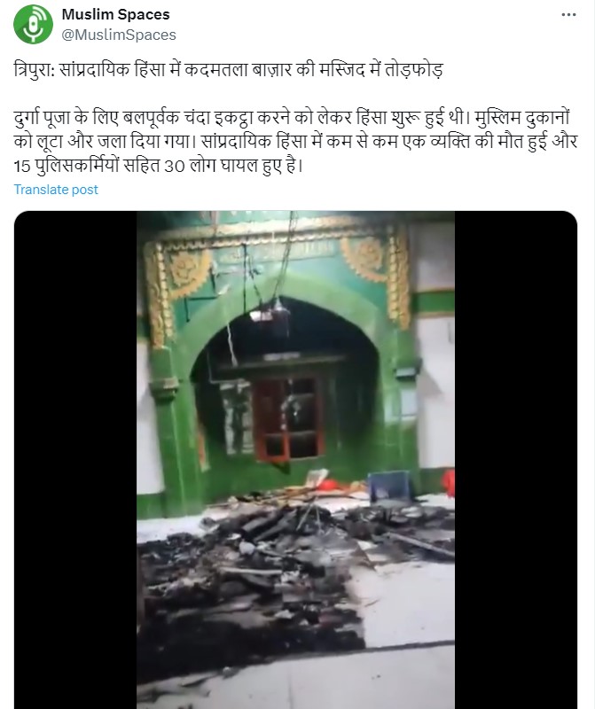 त्रिपुरा: उत्तरी त्रिपुरा के कदमतला जिले में सांप्रदायिक हिंसा के दौरान ‘पुलिस फायरिंग’ में एक मुस्लिम व्यक्ति की मौत हो गई है और करीब 17 लोग घायल हुए हैं।